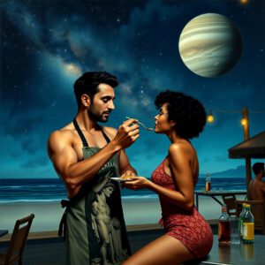 Das Burgers, Pizza und Noodles von Lester lag ganz im Osten der neuen OLYMPOS, in der Mitte des Textilfreien Strandes. Lester hatte nicht vor, jemals wieder während der Arbeit etwas anderes als seine Schürze, welche Michelangelos David mit einem Gemächt bis zu den Knien zeigte, und dazu Sandalen zu tragen. Da sein Lokal nun aber auch außen an den Strip reichte, mussten seine beiden Köche jetzt auch den Selbstbedienungsbereich am inneren Rand mitversorgen. Der junge Mann aus New Orleans hatte mit Nacktheit von Anfang an keine Probleme gehabt, er hatte zu Hause bereits genug davon gesehen, dann aber hatte sein Schicksal die Karten für ihn neu gemischt.